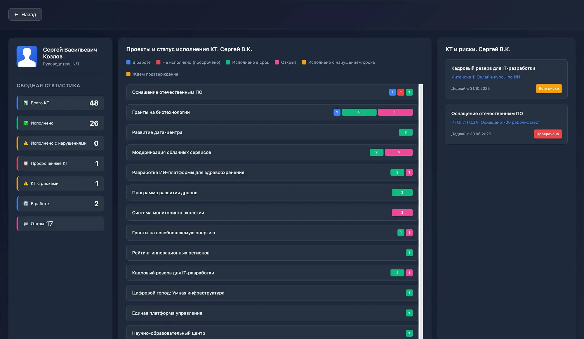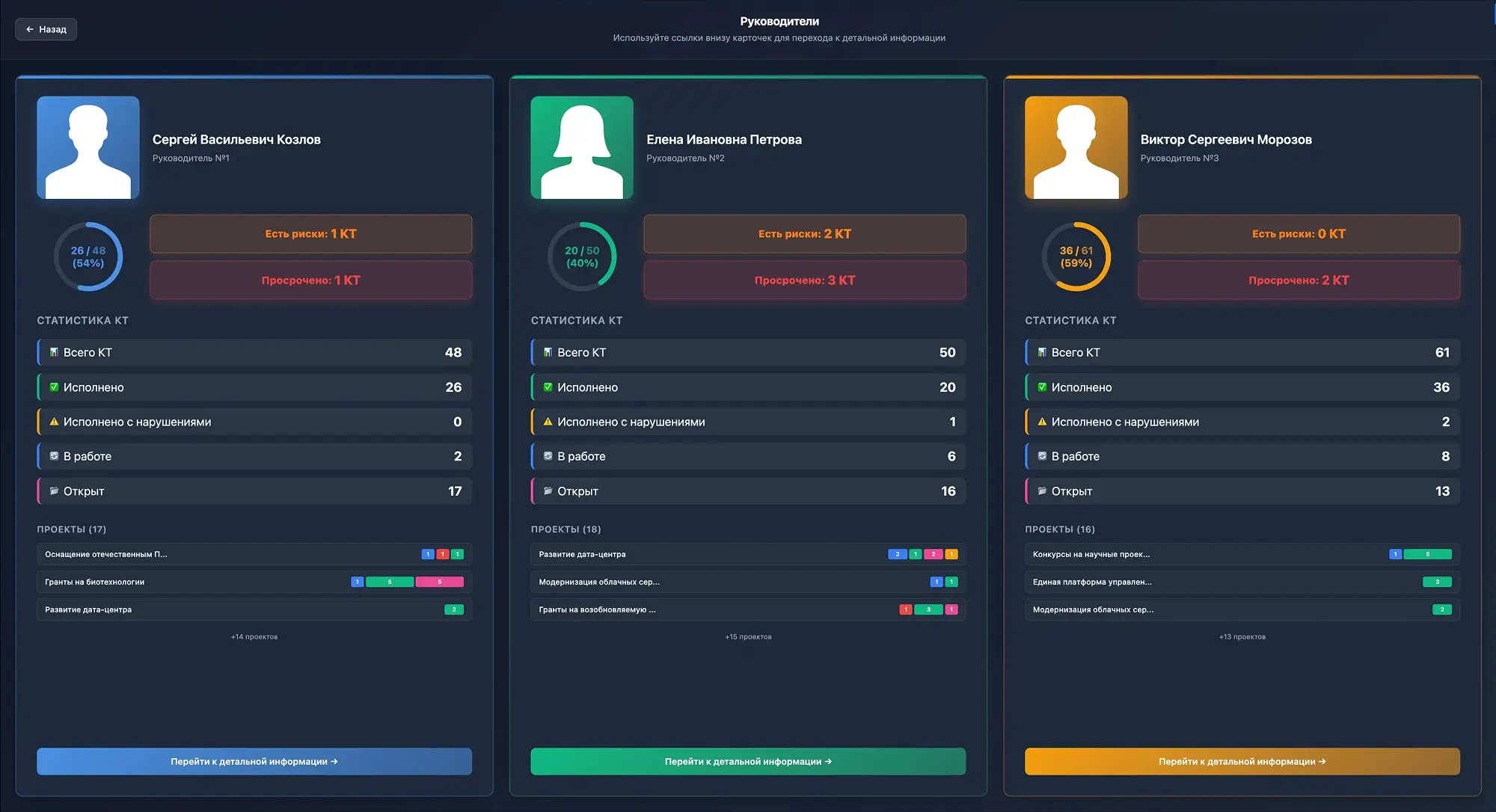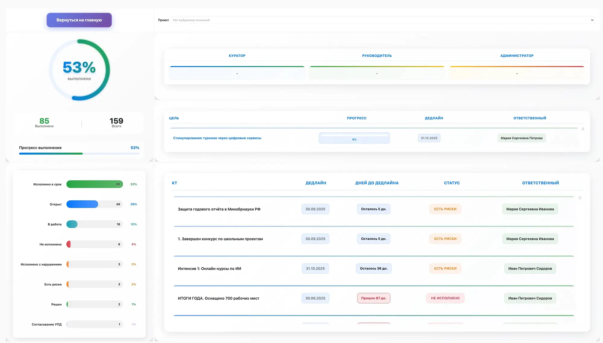 Дашборды объединяют все контрольные точки и задачи, помогают руководителю оценить прогресс, загрузку команд и риски. С его помощью доступно получать, как общие данные, так и более глубокие выводы, которые не были очевидными, но могут стать определяющими при принятии стратегических решений и повысить показатели и результат работы команды.