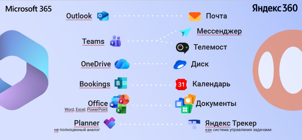 Сравнение касается не отдельных инструментов Microsoft 365 и Яндекс 360, а экосистем: