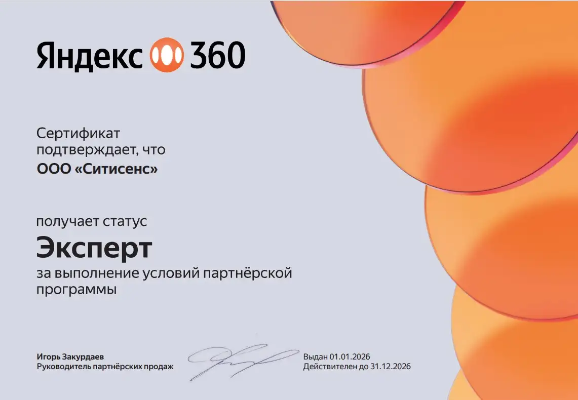 Команда ООО «Ситисенс» объявляет о подтверждении высокого уровня компетенций в области внедрения и продажи решений Яндекс 360.
